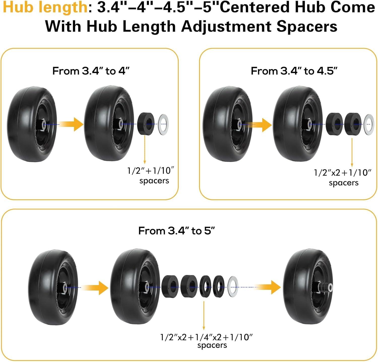 WEIZE Universal Fit 11×4.00-5 Flat Free Tire and Wheel Assembly, Zero Turn Lawn Mower Replacement Tires, 3.4″-4″-4.5″-5″ Centered Hub, 3/4″ or 5/8″ or 1/2″Bushings, Adapter Kit included, Set of 2(Yellow)