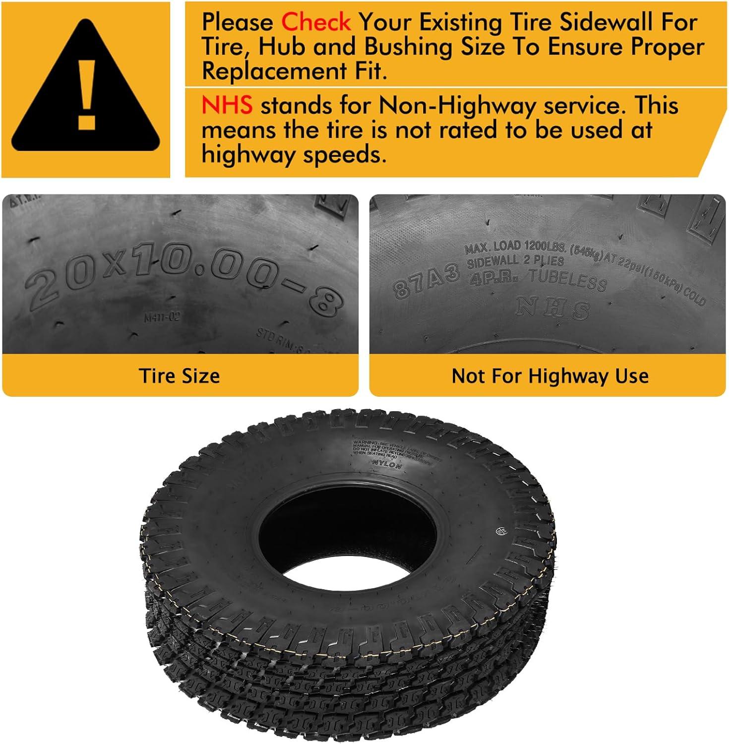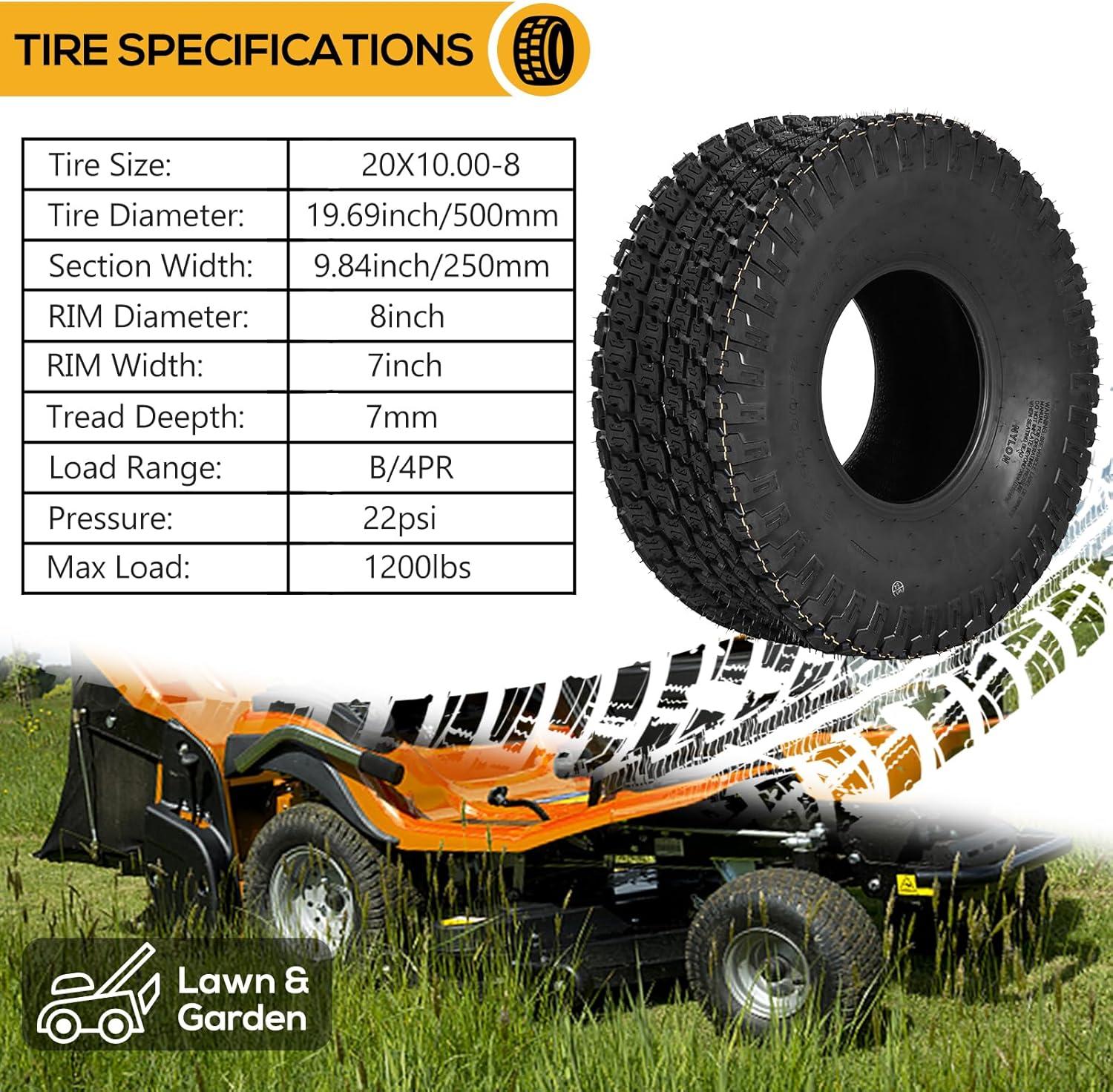 WEIZE 20×10.00-8 Lawn Mower Tire, 20×10-8 Tractor Turf Tire, 20x10x8 NHS Tires, 4 ply Tubeless, 1200lbs Capacity, Set of 2