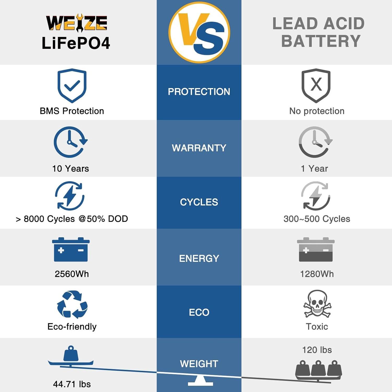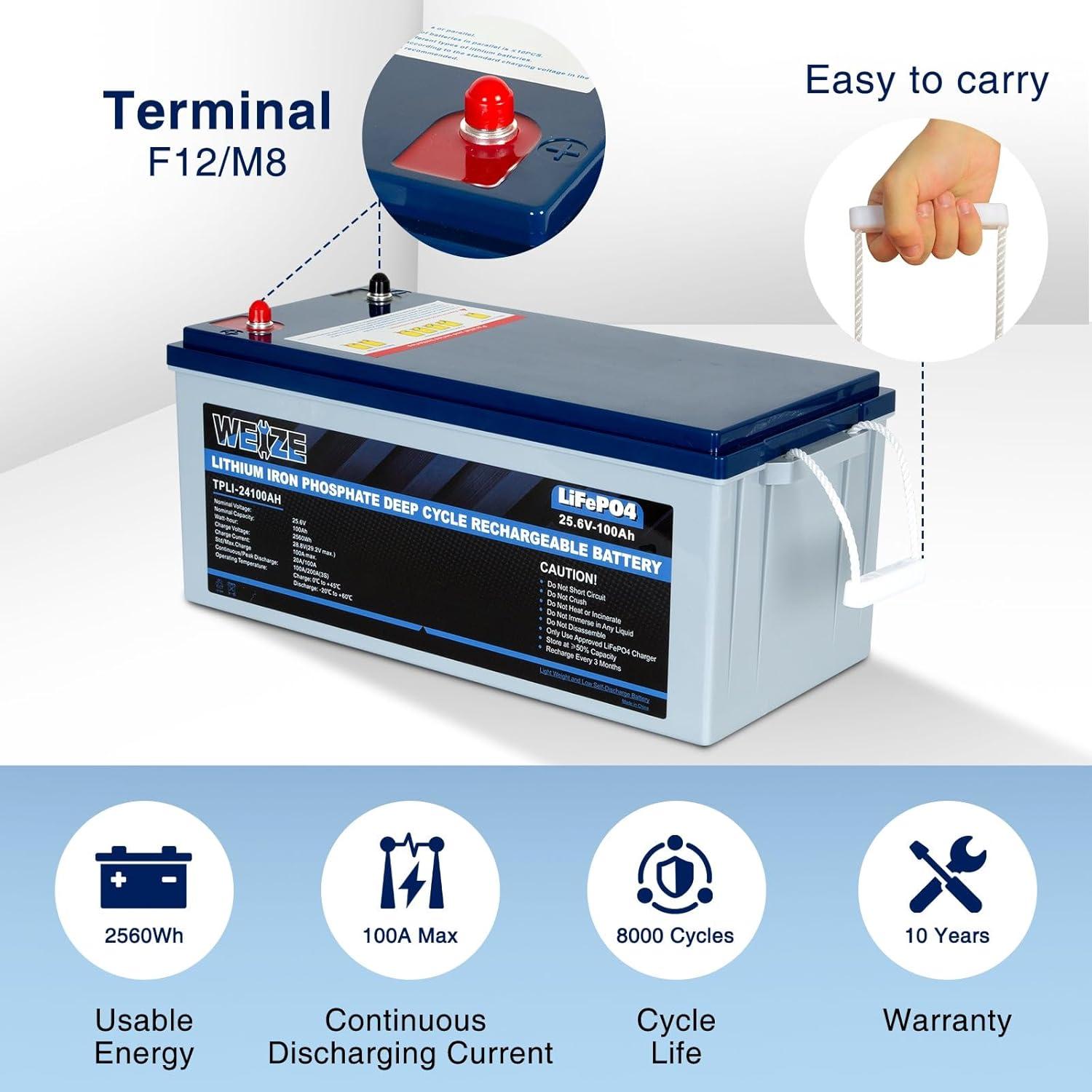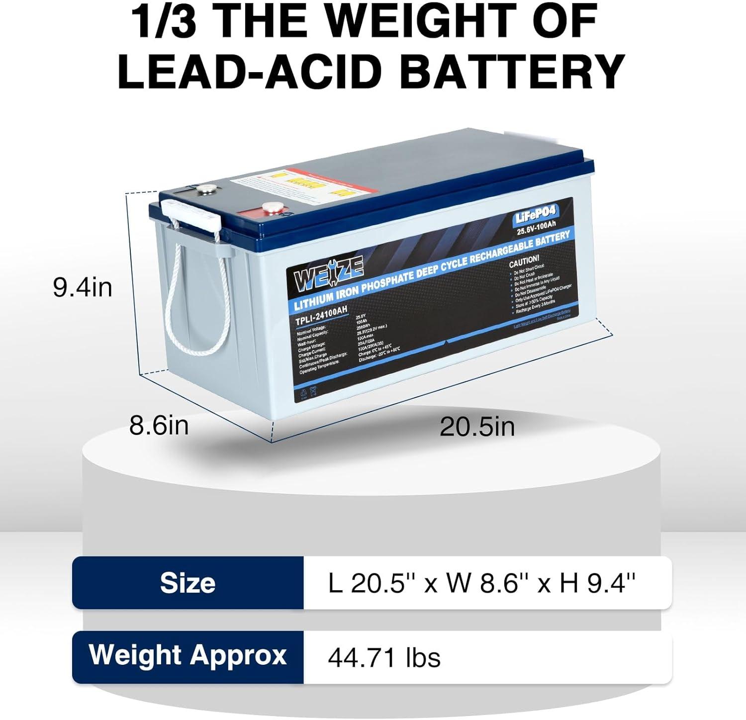 ✅ BUILT TO LAST: Our 24V 100Ah LiFePO4 batteries live more than 2000 cycles at 100%/8000 cycles at 50%(Suggested) depth of discharge, without decreasing in performance. The average lifetime of lead-acid batteries is about two years(500 cycles) at just 50% discharge. This basically means a LiFePO4 battery will last you at least 3 times longer than a lead-acid battery, which actually reduces overall cost. It has cold weather protection which is critical.