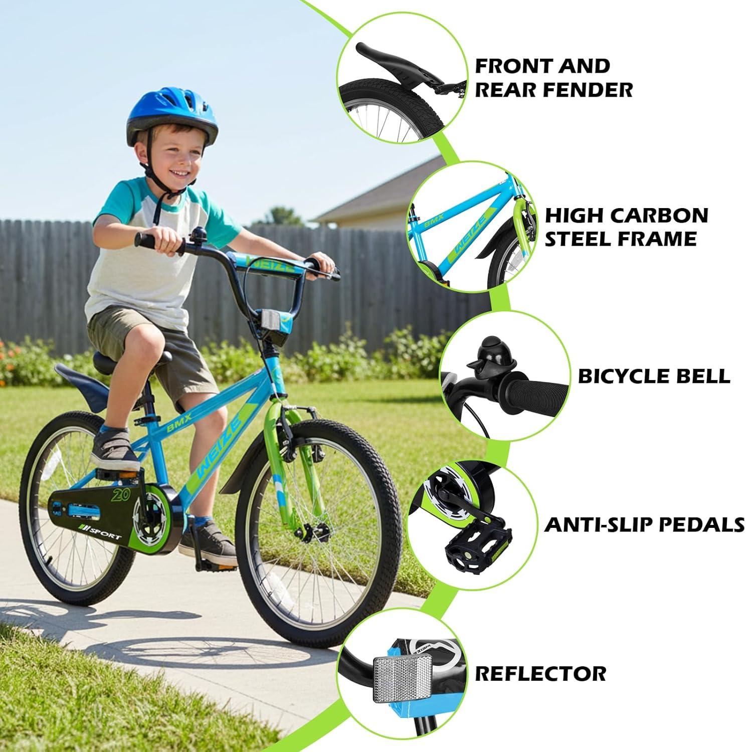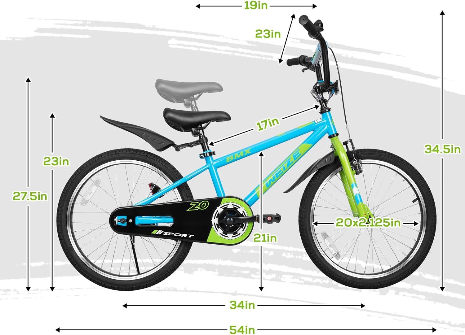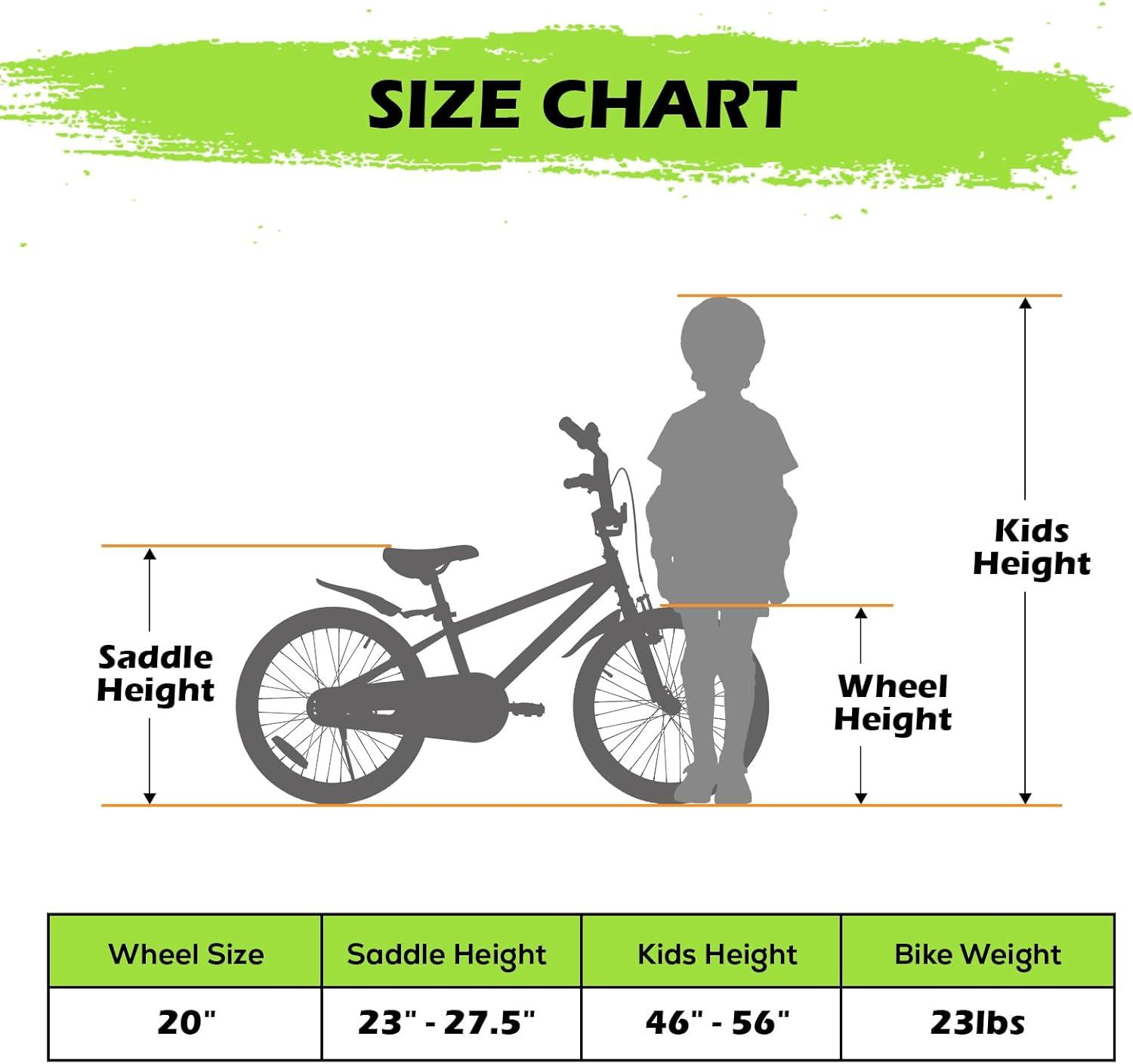 Scientific Age Matching:We offer boy bikes in two sizes: 16 inches and 20 inches. 16 inches are suitable for 4-6 years old (height 43-49 inches), 20 inches are suitable for 6-12 years old (height 46-56 inches), and there are three color options for bicycles to meet individual preferences.