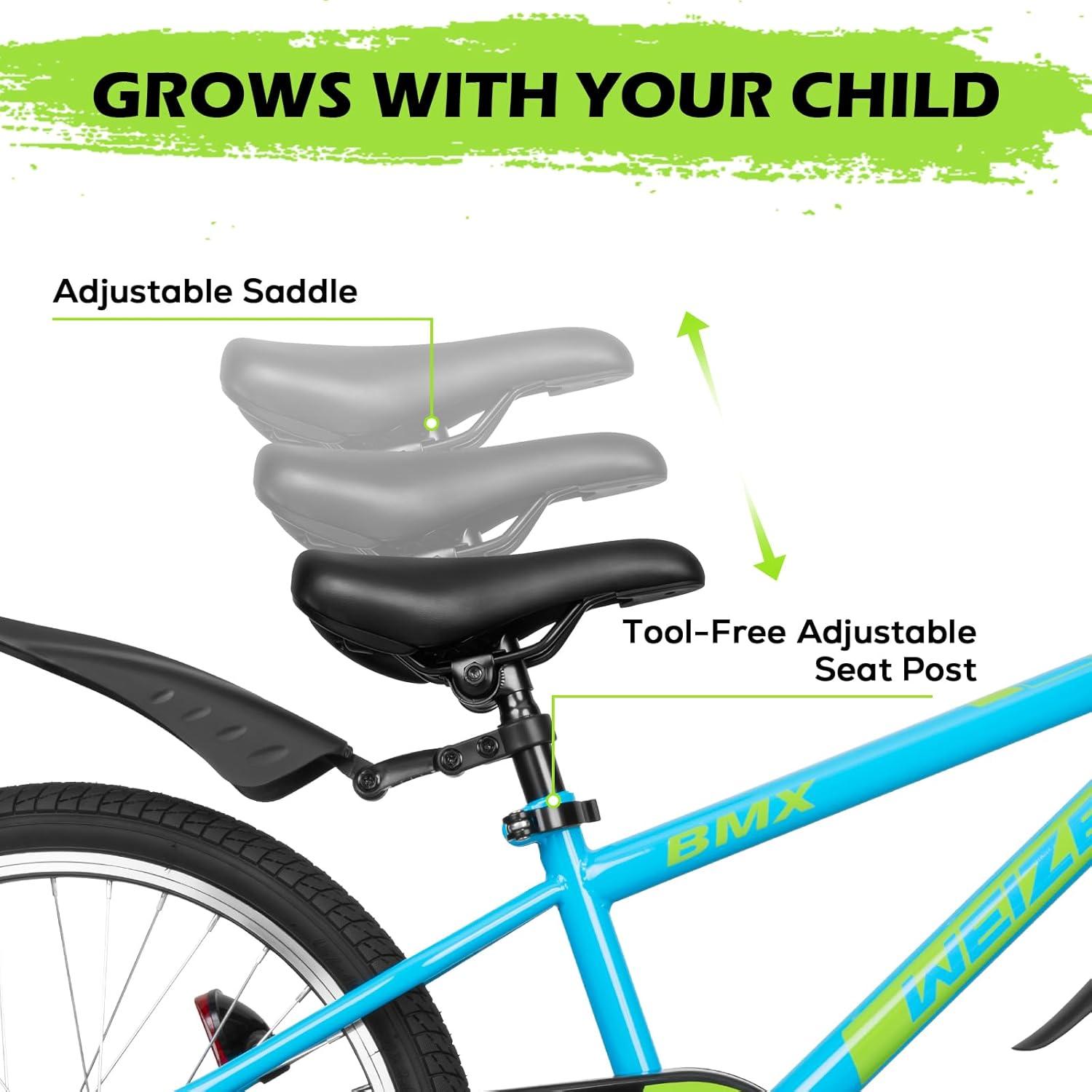 Accompanying Children's Growth:The 16 inch kid bicycle comes standard with detachable auxiliary wheels, which are more stable during the beginner stage and can be removed after proficiency. Adjustable seats without tools and manually adjustable height, easily adapting to the cycling needs of children of different ages.